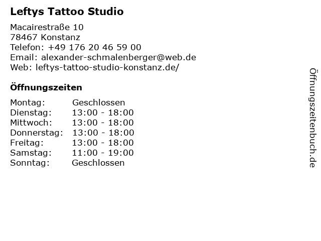 | Öffnungszeiten Leftys Tattoo Studio in Konstanz anzeigen | |