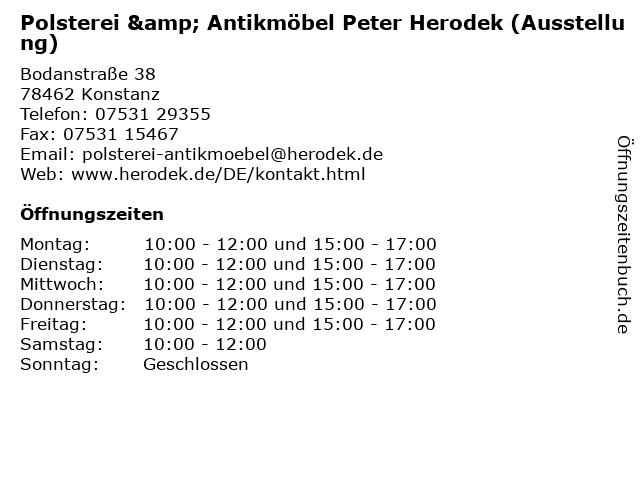 1 Polsterei & Antikmöbel Peter Herodek (Werkstatt) (Entfernung: 0,06 km) Falkengasse 2a, 78462 Konstanz 6 |