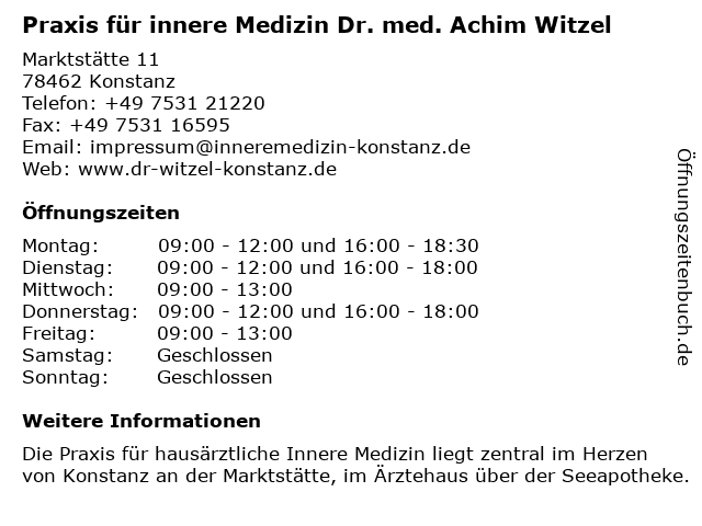 1 Dr. med. Achim Witzel - Praxis für Innere Medizin (Entfernung: 0,00 km) Marktstätte 11, 78462 Konstanz 2 Arztpraxis für ganzheitliche Medizin Marc Benninghaus (Entfernung: 0,02 km) Marktstätte 7, 78462 Konstanz 3 Praxis für Tibetische Medizin Irina Bauscher (Entfernung: 0,17 km) Rosgartenstrasse 28, 78462 Konstanz 4 Praxis für Osteopathische Medizin - Teresa v. Wangenheim (Entfernung: 0,22 km) Wessenbergstraße 22-24, 78462 Konstanz 5 Praxis für Traditionelle Chinesische Medizin Tina Guter (Entfernung: 0,24 km) Wessenbergstr. 22 -24, 78462 Konstanz 6 Achim Hönig Sachverständigenbüro, Immobilienbewertung (Entfernung: 0,24 km) St.-Stephans-Platz 7, 78462 Konstanz |