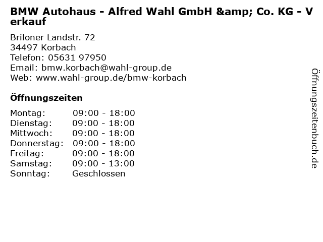 | 1 Korbacher Automobilgesellschaft mbH & Co.KG (Service) (Entfernung: 0,01 km) Briloner Landstr. 72, 34497 Korbach 2 BMW Autohaus - Alfred Wahl GmbH & Co. KG - Teile & Zubehör (Entfernung: 0,01 km) Briloner Landstr. 72, 34497 Korbach 3 BMW Autohaus - Alfred Wahl GmbH & Co. KG - Service (Entfernung: 0,07 km) Briloner Landstr. 72, 34497 Korbach 4 Groß Friedrich GmbH & Co. KG Korbacher Metall- und Eisenhandel (Entfernung: 0,88 km) Am Ziegelgrund 5-9, 34497 Korbach 6 |