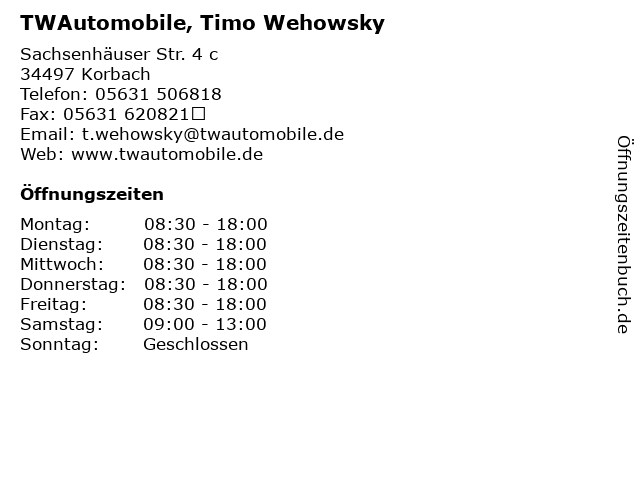 | Öffnungszeiten TWAutomobile, Timo Wehowsky in Korbach anzeigen | |