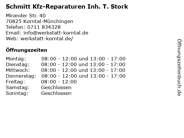 1 Schmitt Kfz-Reparaturen Inh. Tobias Stork Autowerkstatt (Entfernung: 0,02 km) Mirander Str. 40/1, 70825 Korntal-Münchingen 5 6 |