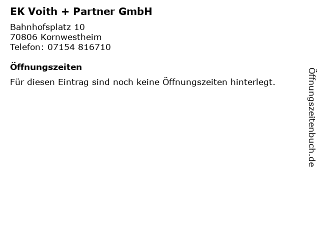 | Öffnungszeiten EK Voith + Partner GmbH in Kornwestheim anzeigen | |