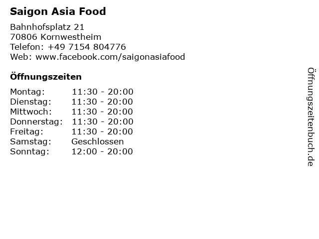 | Öffnungszeiten Saigon Asia Food in Kornwestheim anzeigen | |
