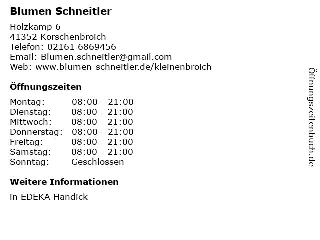 | Öffnungszeiten Blumen Schneitler in Korschenbroich anzeigen | |