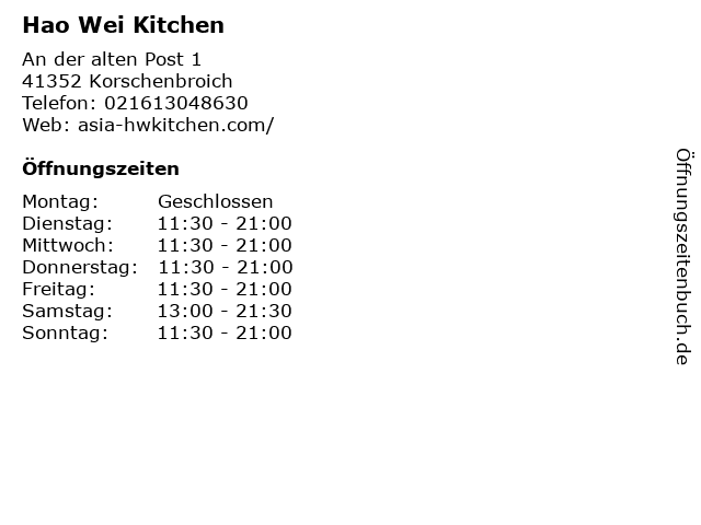 | Öffnungszeiten Hao Wei Kitchen in Korschenbroich anzeigen | |