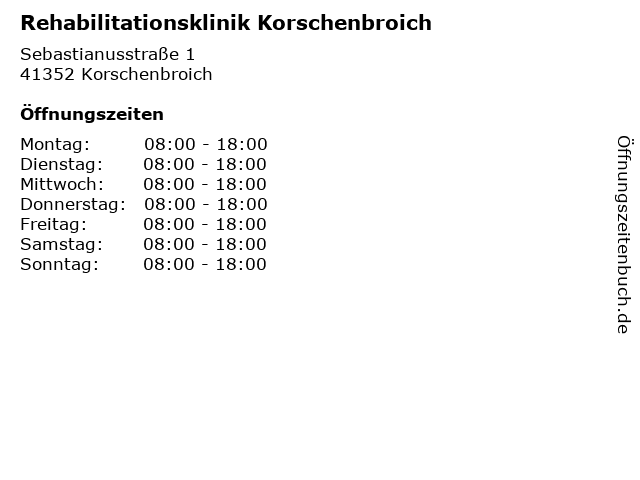 | Öffnungszeiten Rehabilitationsklinik Korschenbroich in Korschenbroich anzeigen | |