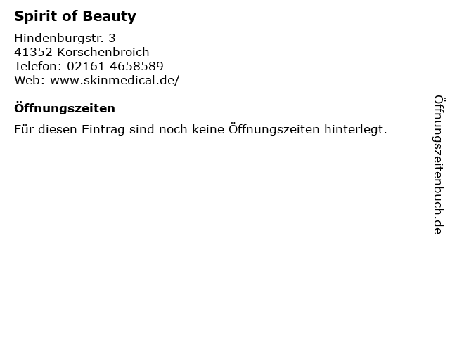 | Öffnungszeiten Spirit of Beauty in Korschenbroich anzeigen | |