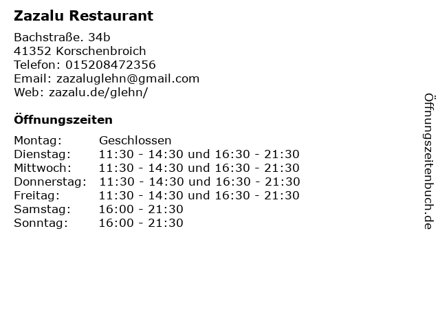 | Öffnungszeiten Zazalu Restaurant in Korschenbroich anzeigen | |