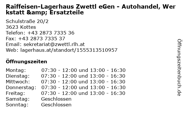 1 Raiffeisen-Lagerhaus Zwettl eGen - Genol Tankstelle (Entfernung: 0,00 km) Schulstraße 20/1, 3623 Kottes 2 Raiffeisen-Lagerhaus Zwettl eGen - Agrar, Baustoffe, Brennstoffe, Holzankauf (Entfernung: 0,00 km) Schulstraße 20/1, 3623 Kottes 3 Raiffeisen-Lagerhaus Zwettl eGen - Landmaschinenhandel (Entfernung: 0,00 km) Schulstraße 20/2, 3623 Kottes 4 Raiffeisen-Lagerhaus Zwettl eGen - Baumarkt Haus & Garten (Entfernung: 0,09 km) Schulstraße 20/1, 3623 Kottes 5 Raiffeisen-Lagerhaus Zwettl eGen - Agrar, Bau & Garten, Baustoffe und Brennstoffe (Entfernung: 7,89 km) Schulstraße 20/1, 3623 Kottes 6 Raiffeisen-Lagerhaus Zwettl eGen - Ersatzteile, Werkstätte Landmaschinen und Werkstätte PKW (Entfernung: 7,89 km) Schulstraße 20/1, 3623 Kottes |