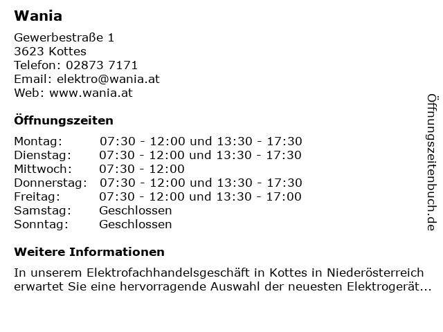 | Öffnungszeiten Wania in Kottes anzeigen | |