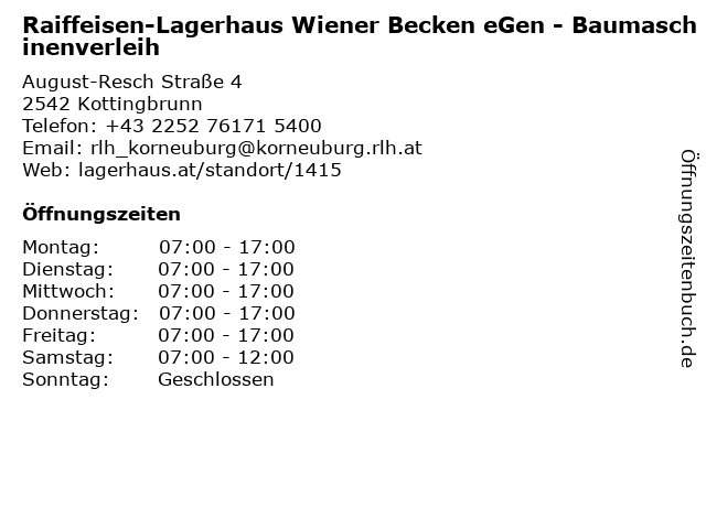 1 Raiffeisen-Lagerhaus Wiener Becken eGen - Tankstelle (Entfernung: 0,03 km) August Resch Straße 4, 2542 Kottingbrunn 2 Raiffeisen-Lagerhaus Wiener Becken eGen - alle Abteilungen ausser Agrar (Entfernung: 0,03 km) August-Resch-Straße 4, 2542 Kottingbrunn 3 Raiffeisen-Lagerhaus Wiener Becken eGen - Agrar (Entfernung: 0,03 km) August-Resch Straße 4, 2542 Kottingbrunn 4 Raiffeisen-Lagerhaus Wiener Becken eGen - Genol Tankstelle (Entfernung: 6,51 km) Oberwaltersdorferstraße 2, 2523 Tattendorf 5 Raiffeisen-Lagerhaus Wiener Becken eGen (Entfernung: 6,57 km) Oberwaltersdorferstraße 2, 2523 Tattendorf 6 |