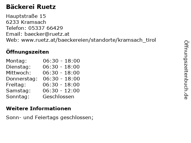 | Öffnungszeiten Bäckerei Ruetz in Kramsach anzeigen | |