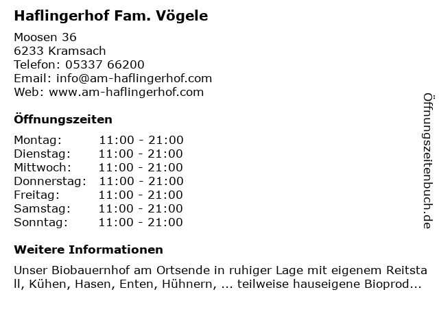 | Öffnungszeiten Haflingerhof Fam. Vögele in Kramsach anzeigen | |