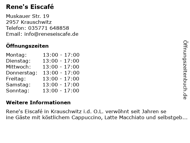 Hinweis: Rene's Eiscafé in Krauschwitz i.d. O.L. verwöhnt seit Jahren seine Gäste mit köstlichem Cappuccino, Latte Macchiato und selbstgebackenem Kuchen.