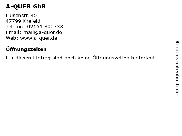 | Öffnungszeiten A-QUER GbR in Krefeld anzeigen | |