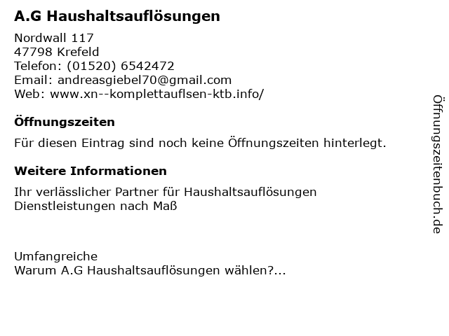 | Telefonnummer A.G Haushaltsauflösungen in Krefeld ((01520) 6542472) anrufen | |