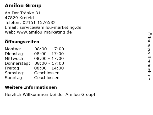 | Öffnungszeiten Amilou Group in Krefeld anzeigen | |