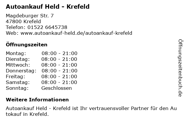 | Öffnungszeiten Autoankauf Held - Krefeld in Krefeld anzeigen | |