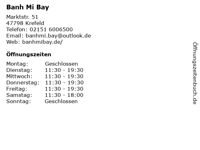 | Öffnungszeiten Banh Mi Bay in Krefeld anzeigen | |