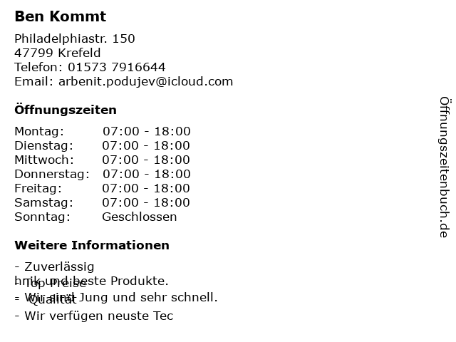 | Öffnungszeiten Ben Kommt in Krefeld anzeigen | |