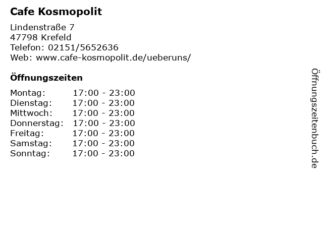| Öffnungszeiten Cafe Kosmopolit in Krefeld anzeigen | |