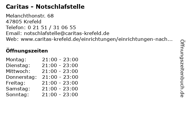 | Öffnungszeiten Caritas - Notschlafstelle in Krefeld anzeigen | |