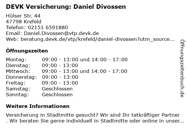 Branchen & Suchbegriffe zu DEVK Versicherung: Daniel Divossen:altersvorsorge, autoversicherung, berufsunfähigkeitsversicherung, daniel, devk, divossen, gebäude- und hausratsversicherung, gewerbeversicherung, kfz-versicherung (motorrad), lebensversicherung, mietrechtsschutzversicherung, reiseversicherungsagentur, versicherung |