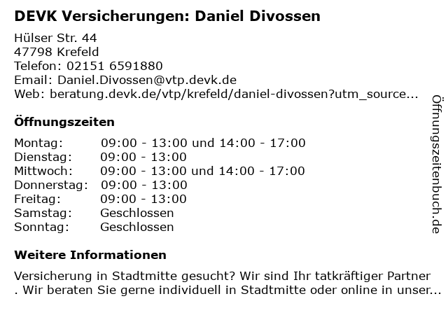 Branchen & Suchbegriffe zu DEVK Versicherungen: Daniel Divossen:altersvorsorge, autoversicherung, berufsunfähigkeitsversicherung, daniel, devk, divossen, gebäude- und hausratsversicherung, gewerbeversicherung, kfz-versicherung (motorrad), lebensversicherung, mietrechtsschutzversicherung, reiseversicherungsagentur, versicherungen |