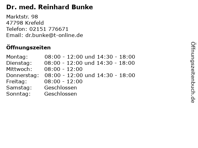 | Öffnungszeiten Dr. med. Reinhard Bunke in Krefeld anzeigen | |