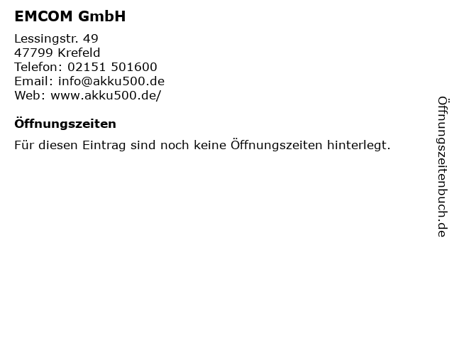 | Öffnungszeiten EMCOM GmbH in Krefeld anzeigen | |