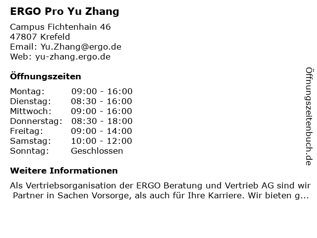 | Öffnungszeiten ERGO Pro Yu Zhang in Krefeld anzeigen | |