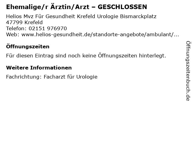 2 Ehemalige/r Ärztin/Arzt – GESCHLOSSEN (Entfernung: 1,02 km) Helios Mvz Krefeld Gefäßmedizin , 47799 Krefeld 3 Ehemalige/r Ärztin/Arzt – GESCHLOSSEN (Entfernung: 5,13 km) Mvz Für Gesundheit West Gmbh , 47829 Krefeld 4 Ehemalige/r Ärztin/Arzt – GESCHLOSSEN (Entfernung: 18,05 km) Helios Mvz Ruhr Für Neurochirurgie , 47057 Duisburg 5 Ehemalige/r Ärztin/Arzt – GESCHLOSSEN (Entfernung: 18,05 km) Helios Mvz Ruhr Für Neurochirurgie , 47057 Duisburg 6 Ehemalige/r Ärztin/Arzt – GESCHLOSSEN (Entfernung: 18,26 km) Helios Mvz Für Kardiologie Und Pulmologie , 47475 Kamp-Lintfort |