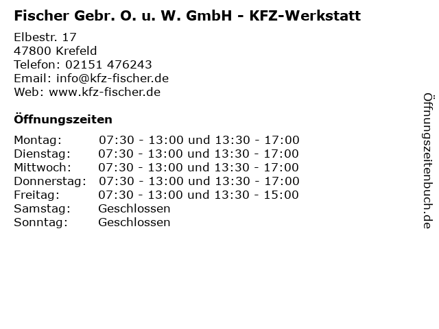 Branchen & Suchbegriffe zu Fischer Gebr. O. u. W. GmbH - KFZ-Werkstatt:achsvermessung, fahrzeugdiagnose, fischer, gebr., inspektion, kfz, klimaservice, o., reifenservice, reparatur, u., unfallservice, w., wartung, werkstatt, ölwechsel |