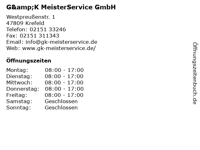 | Öffnungszeiten G&K MeisterService GmbH in Krefeld anzeigen | |