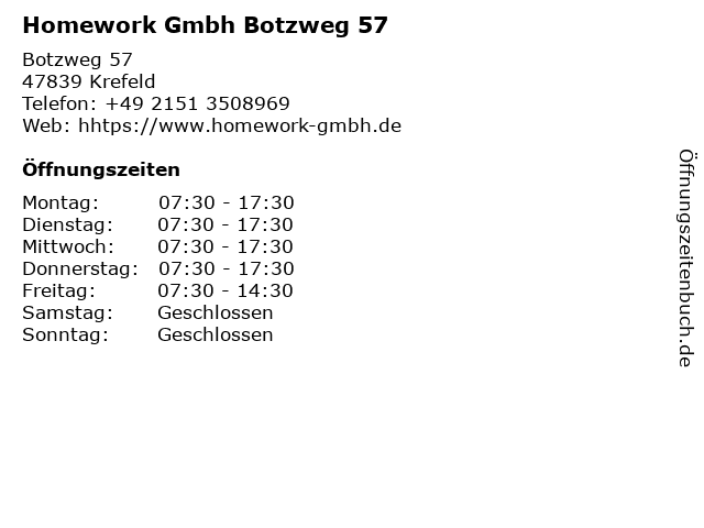 | Öffnungszeiten Homework Gmbh Botzweg 57 in Krefeld anzeigen | |