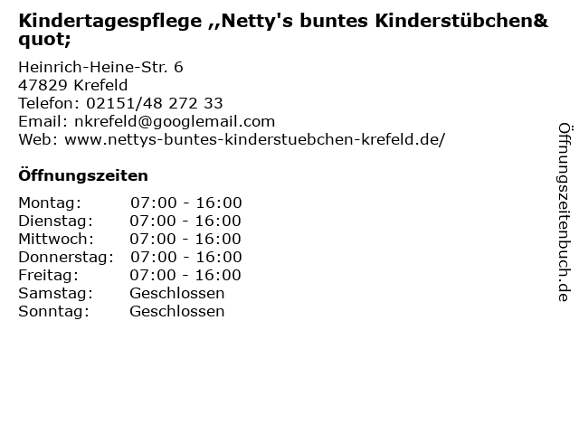 5 Kindertagespflege Bunte Raupe Angelique Jennert (Entfernung: 1,64 km) Am Badezentrum 163, 47800 Krefeld 6 |