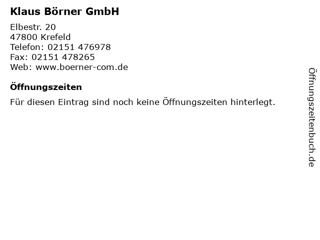 | Öffnungszeiten Klaus Börner GmbH in Krefeld anzeigen | |