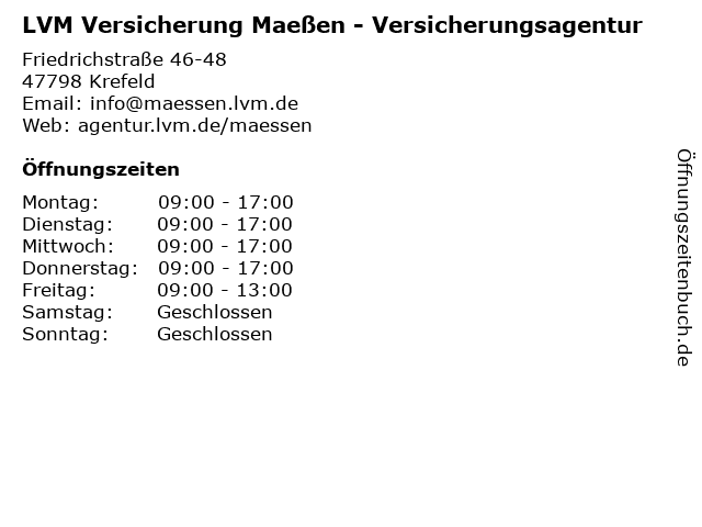| Öffnungszeiten LVM Versicherung Maeßen - Versicherungsagentur in Krefeld anzeigen | |