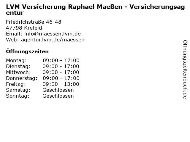 | Öffnungszeiten LVM Versicherung Raphael Maeßen - Versicherungsagentur in Krefeld anzeigen | |