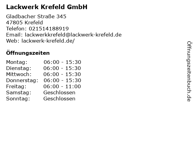 | Öffnungszeiten Lackwerk Krefeld GmbH in Krefeld anzeigen | |
