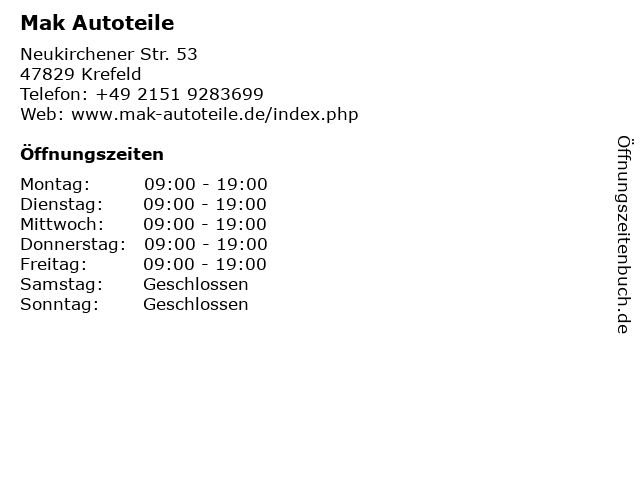 | Öffnungszeiten Mak Autoteile in Krefeld anzeigen | |