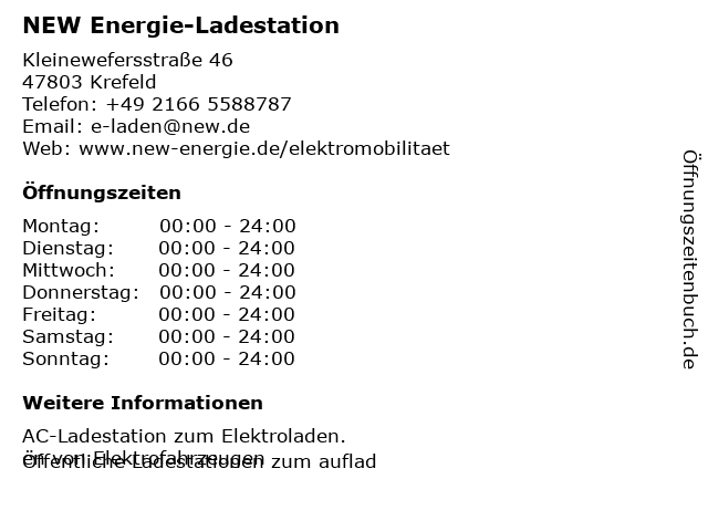 | Öffnungszeiten NEW Energie-Ladestation in Krefeld anzeigen | |