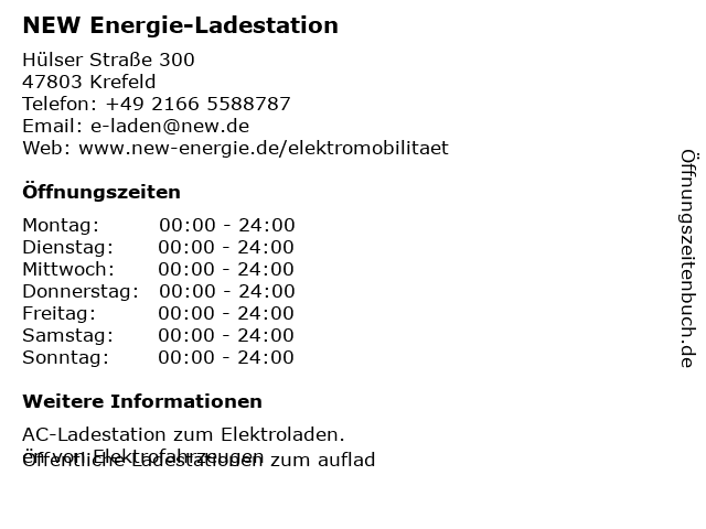 | Öffnungszeiten NEW Energie-Ladestation in Krefeld anzeigen | |