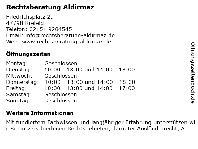 | Öffnungszeiten Rechtsberatung Aldirmaz in Krefeld anzeigen | |