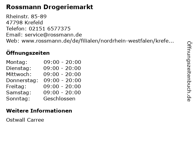| Öffnungszeiten Rossmann Drogeriemarkt in Krefeld anzeigen | |