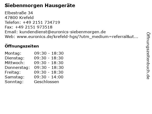 | Öffnungszeiten Siebenmorgen Hausgeräte in Krefeld anzeigen | |