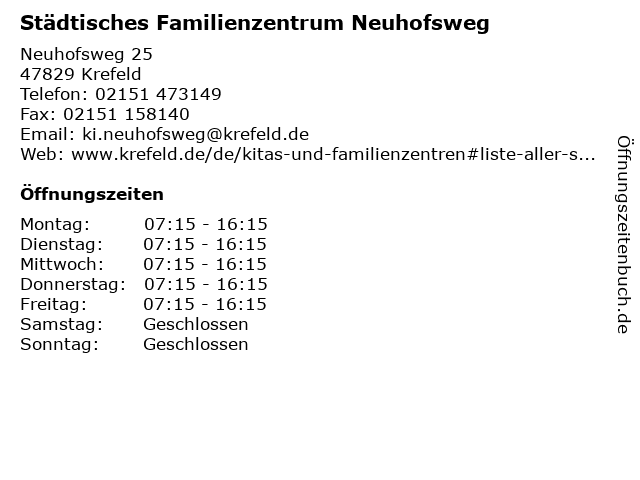 4 Städtisches Familienzentrum Steckendorfer Straße (Entfernung: 5,17 km) Steckendorfer Str. 60a, 47799 Krefeld 6 |