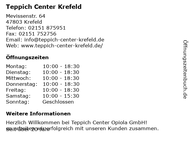 | Öffnungszeiten Teppich Center Krefeld in Krefeld anzeigen | |