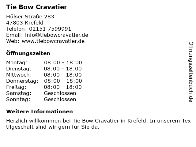 | Öffnungszeiten Tie Bow Cravatier in Krefeld anzeigen | |